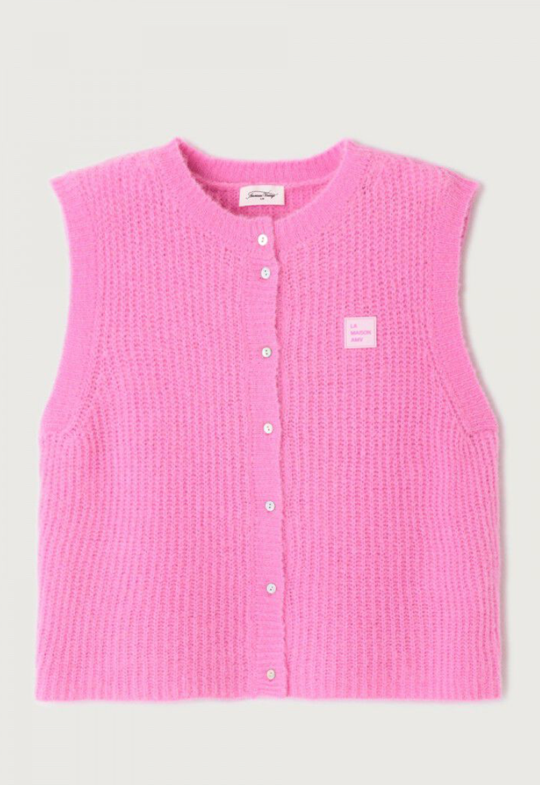 De East gilet, gemaakt van een mix van Italiaanse garen. Het zachte, lichte breisel kan het hele jaar door worden gedragen.