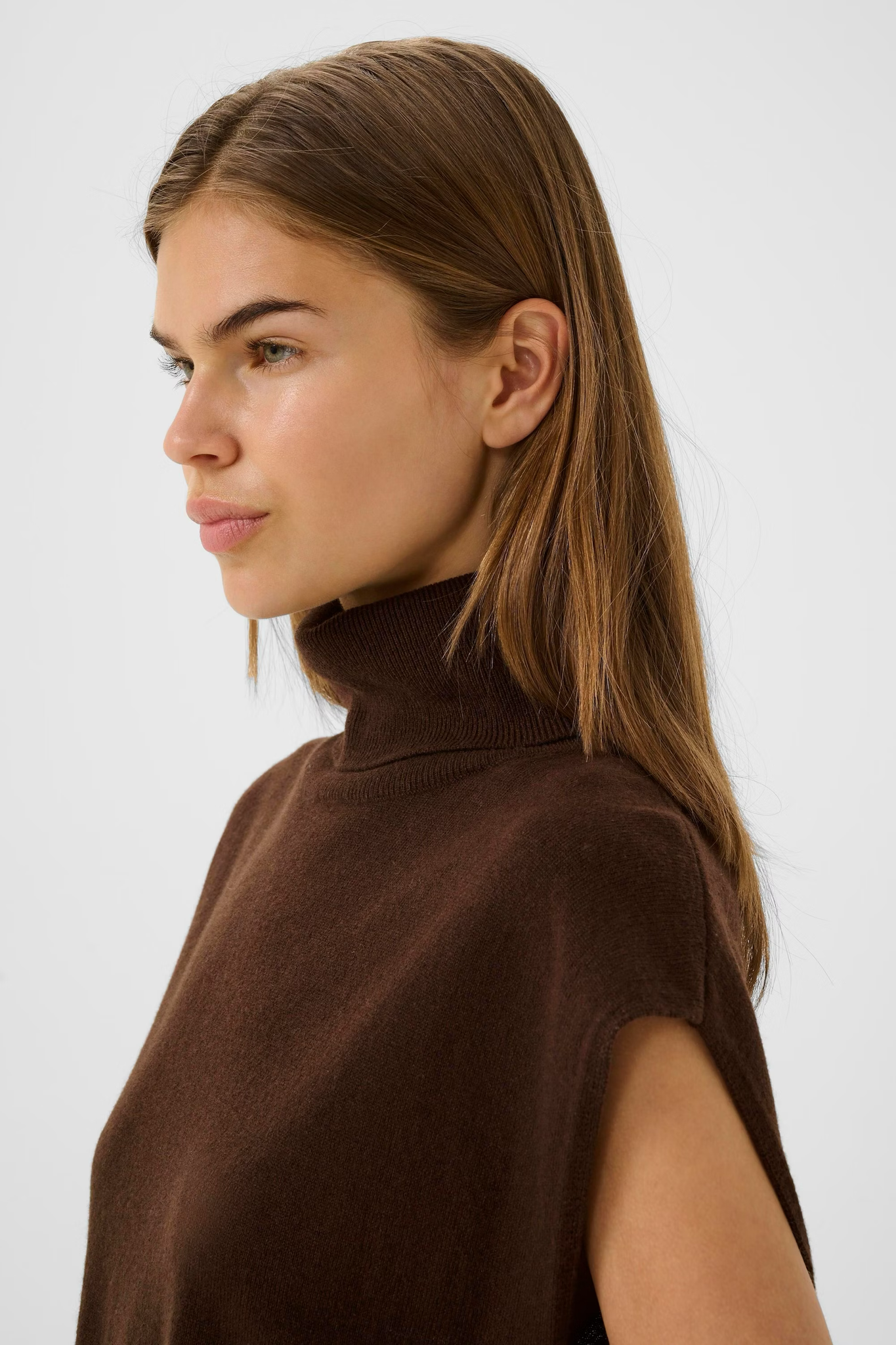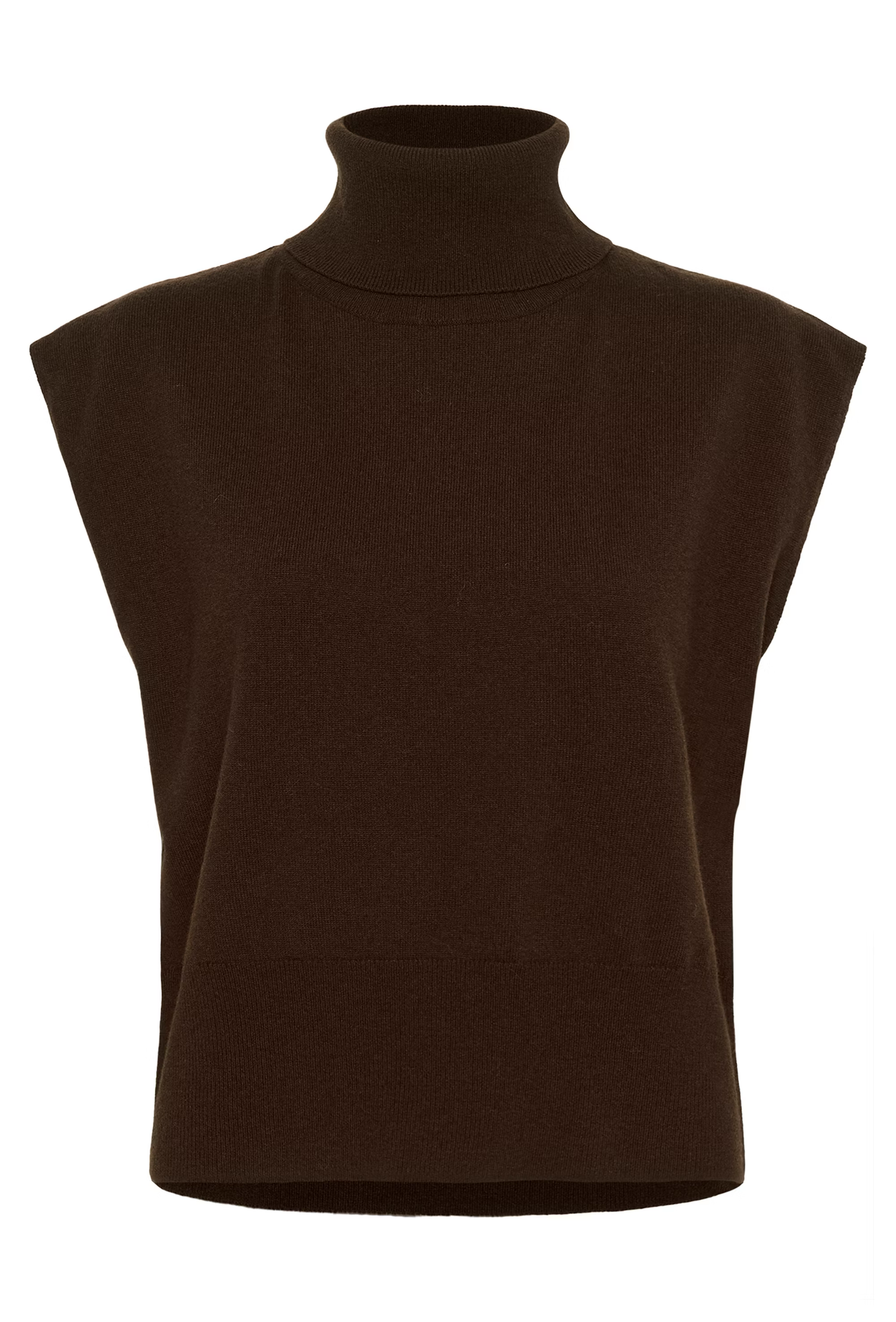 Knitted sleeveless turtleneck vest offering a comfortable relaxed fit. Features a high neckline and a straight-cut silhouette, versatile for layering or standalone wear in any season. The model is 179 cm tall and is wearing size S/36.