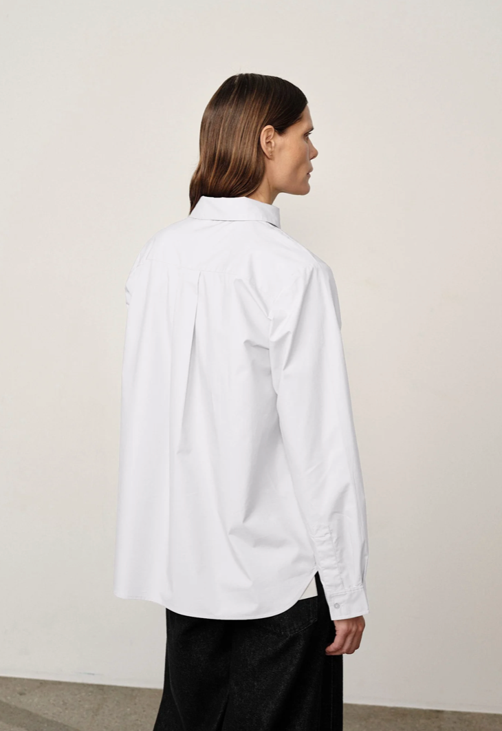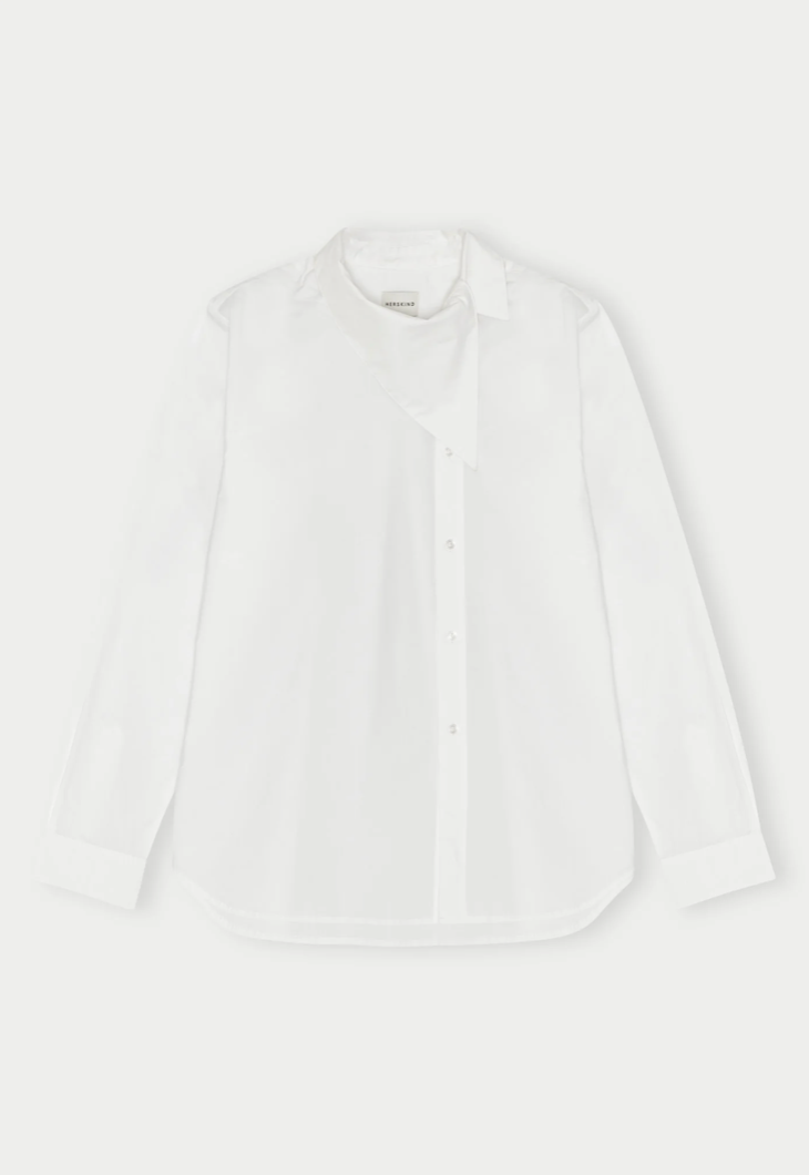 Introducing the Mila Shirt: An asymmetrical collar shirt with a regular fit. It features slightly dropped shoulders and an asymmetrical button closure.