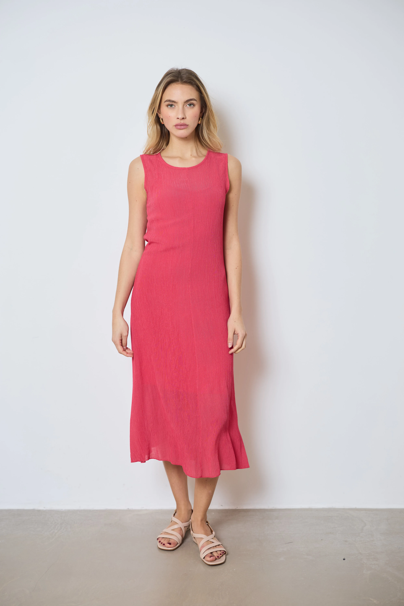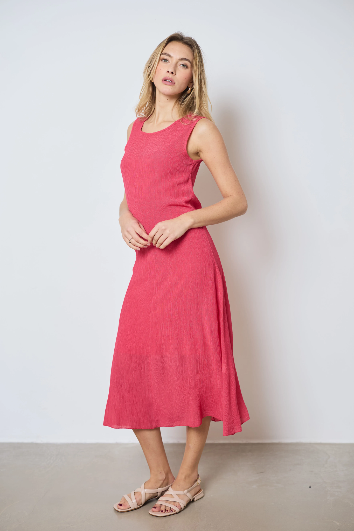 Breng elegantie en lichtheid in uw verschijning met de lange, mouwloze Albane-jurk. De soepele, gekreukte stof en de onderjurk zorgen voor een prachtig spel van transparantie, met een kleine opening aan de achterkant voor een verfijnde touch.