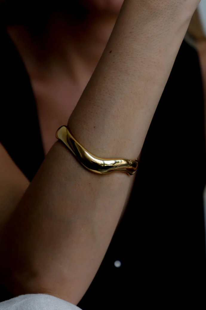 Aimee is een elegante cuff armband die vervaardigd is uit hoogwaardig stainless steel. Het golvende minimalistische design zorgt voor een tijdloze en verfijnde uitstraling. Dankzij het open ontwerp en het stevige maar licht buigzame materiaal, kan de armband aangepast worden aan je polsmaat door er kracht op uit te oefenen.
