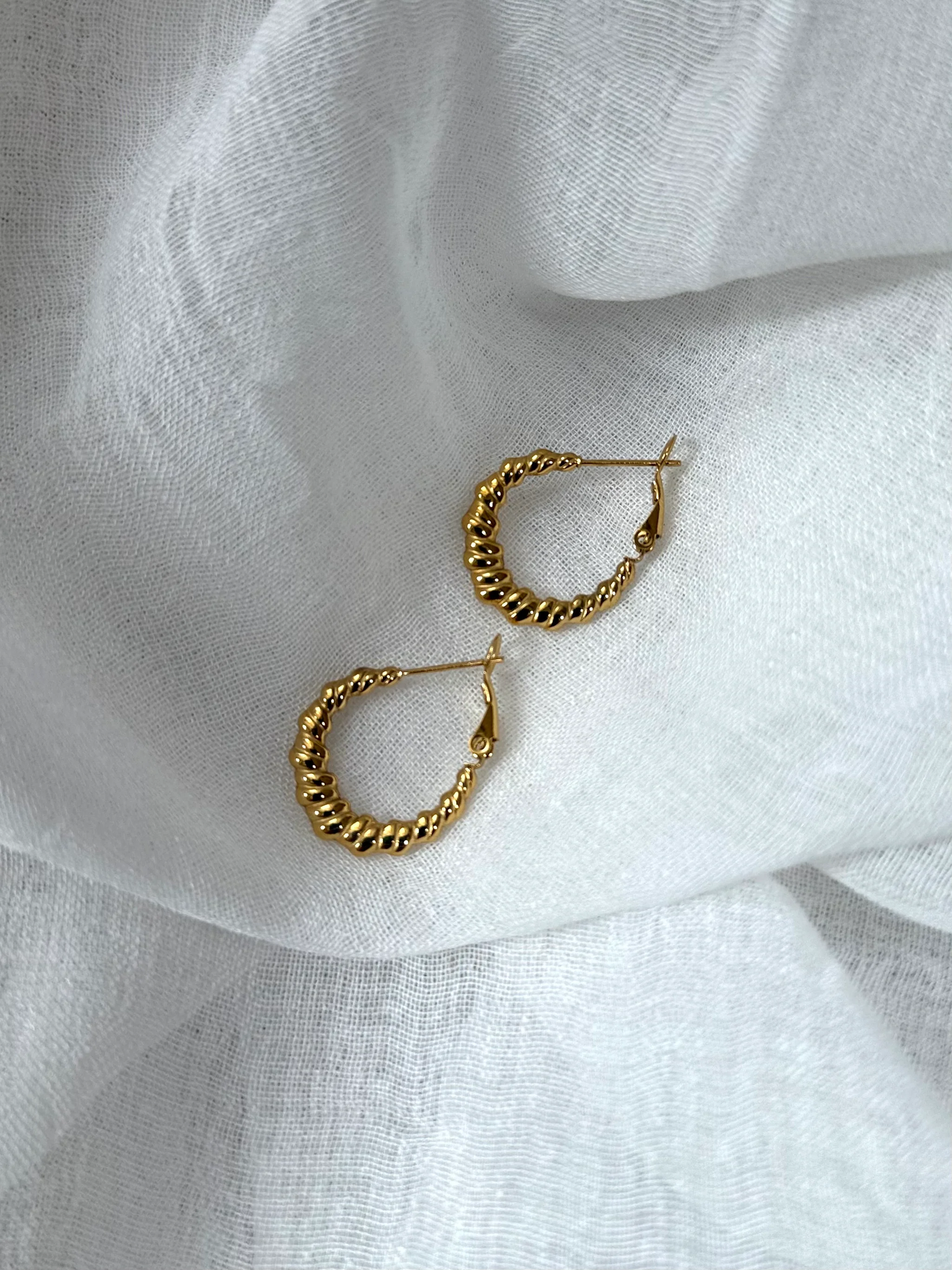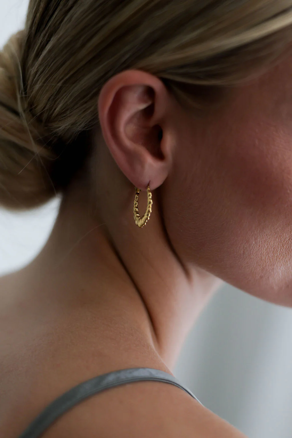 Voeg een vleugje elegantie toe aan je look met deze gedraaide gouden oorringen. Met hun subtiele twist-design en warme glans zijn oorbellen een perfecte mix van klassiek en modern. Ontworpen voor dagelijks comfort van casual tot chique.